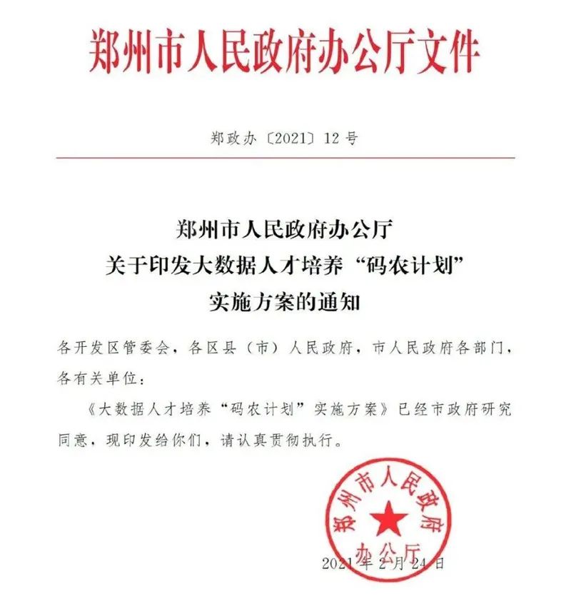 今年2月,郑州市人民政府出台了《大数据人才培养“码农计划”实施方案》,《方案》提出,力争用3年左右时间,共建一批现代产业学院和高水平实训基地,为郑州大数据产业储备10万名有专业技术水平和实践操作经验的人才。