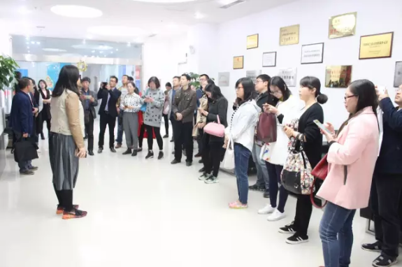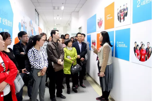 随后薛老师带领老师们参观了云和教育教学区,薛老师按照软装墙上的内容,依次介绍了云和教育就业明星薪资情况、高级师资团队成员、优秀学生作品……老师们认真听讲的时候还不忘用相机记录,无不感叹云和教育的成熟性和专业性。